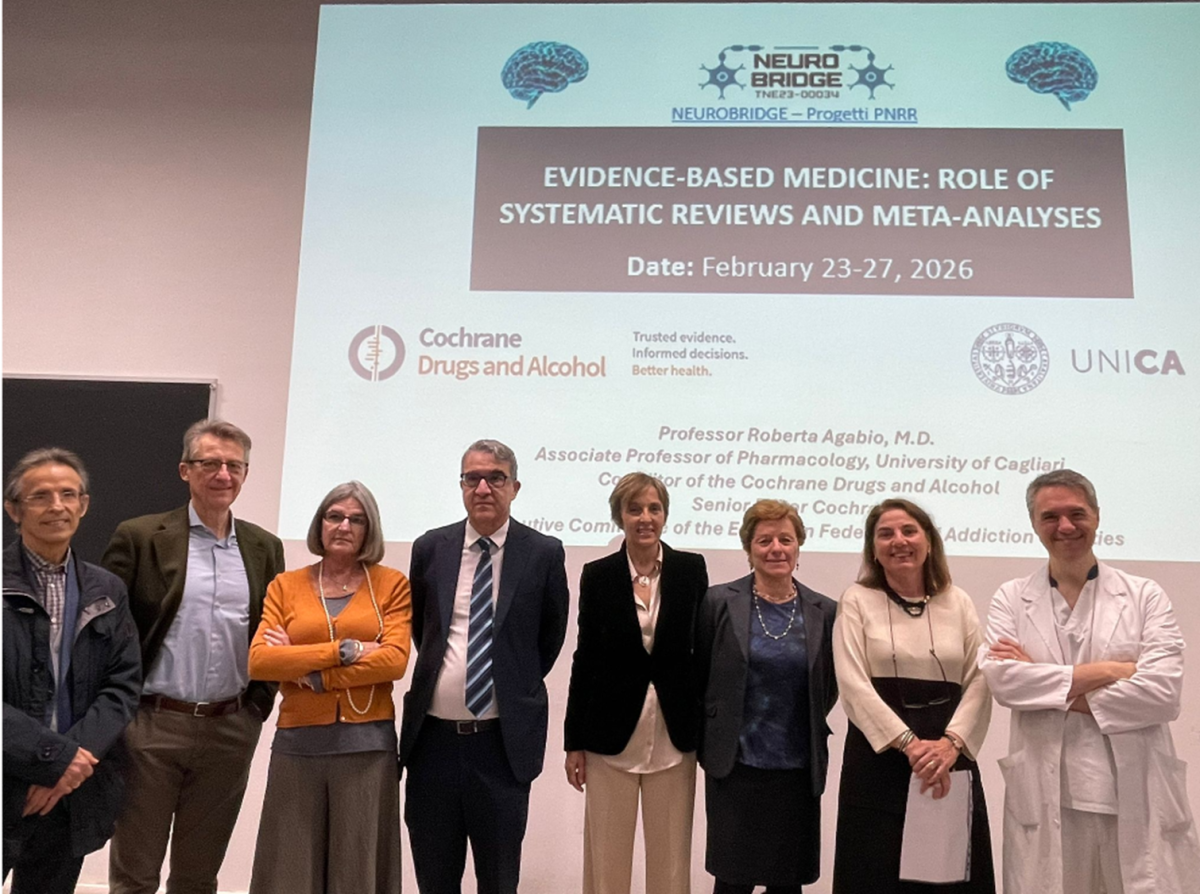 The course "Evidence-based medicine: role of systematic reviews and meta-analyses" has been held at the University of Cagliari from February 23 to 27, 2026. The event was funded by PNRR-TNE (Transnational Educational Initiatives) funds which include the Neurobridge project. Neurobridge is an international educational project in the field of neuroscience and neurotechnology, coordinated by the Scuola Normale Superiore di Pisa, with the Polytechnic University of Bari, the Scuola Sant'Anna, the University of Cagliari and the University of Pisa, together with international partners, especially from emerging countries. At the University of Cagliari, the Neurobridge project is led by Prof Paola Fadda, Full Professor of Pharmacology.